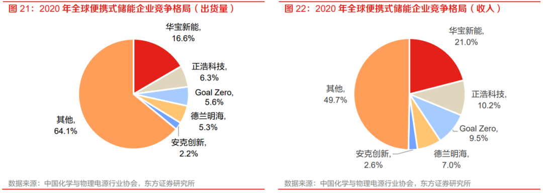 便携式储能产业链环节更少,上中游环节和户用储能类似。省去了安装环节,直接由集成商销售给C端客户或中间再经历一层分销商。正浩科技是便携式储能头部企业之一,2020年约占10%的市场份额。从产品力上看,正浩科技的产品在功率和容量上更具优势,反映了正浩对产品方案设计和开发能力。