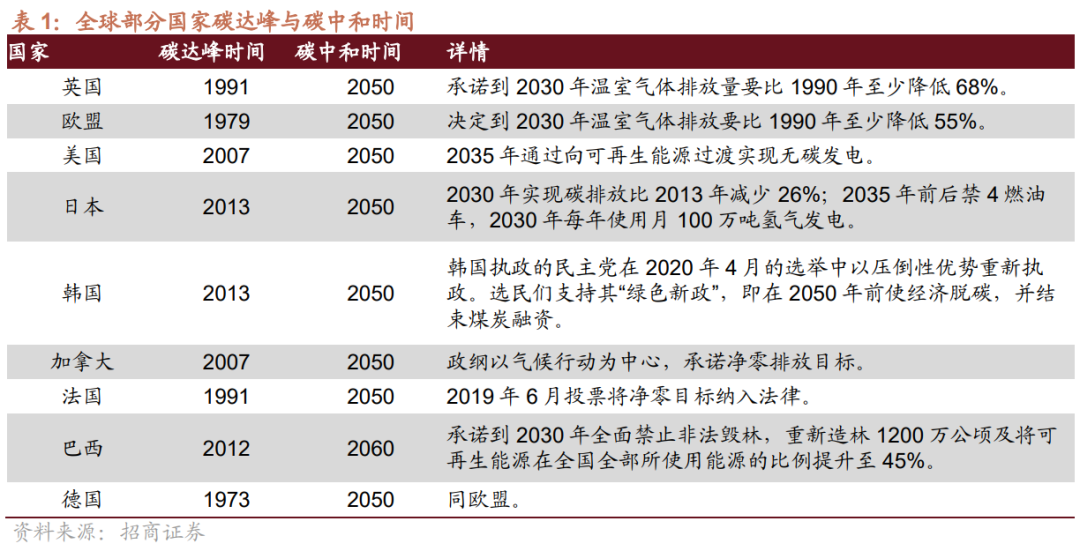 第三次转变则在当下,随着碳排放的不断增加,全球气候变暖带来的一系列极端反应成为现实棘手问题。因此,各国和地区相继提出“碳达峰”、“碳中和”的双碳目标。中国在2020年9月正式提出在2030年前实现“碳达峰”,也就是碳排放达到最高点,之后逐步开始下降;2060年前实现“碳中和”,即排放的碳量和吸收的碳量实现正负抵消。