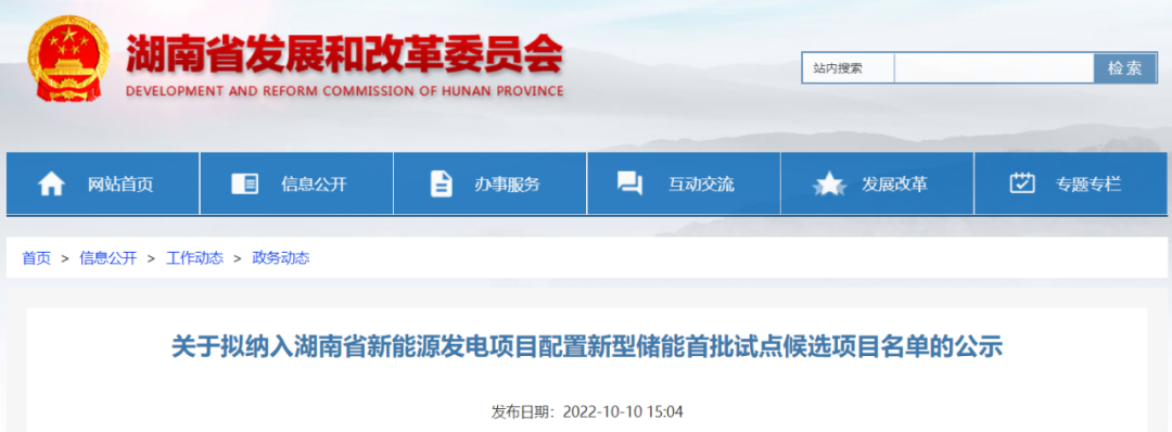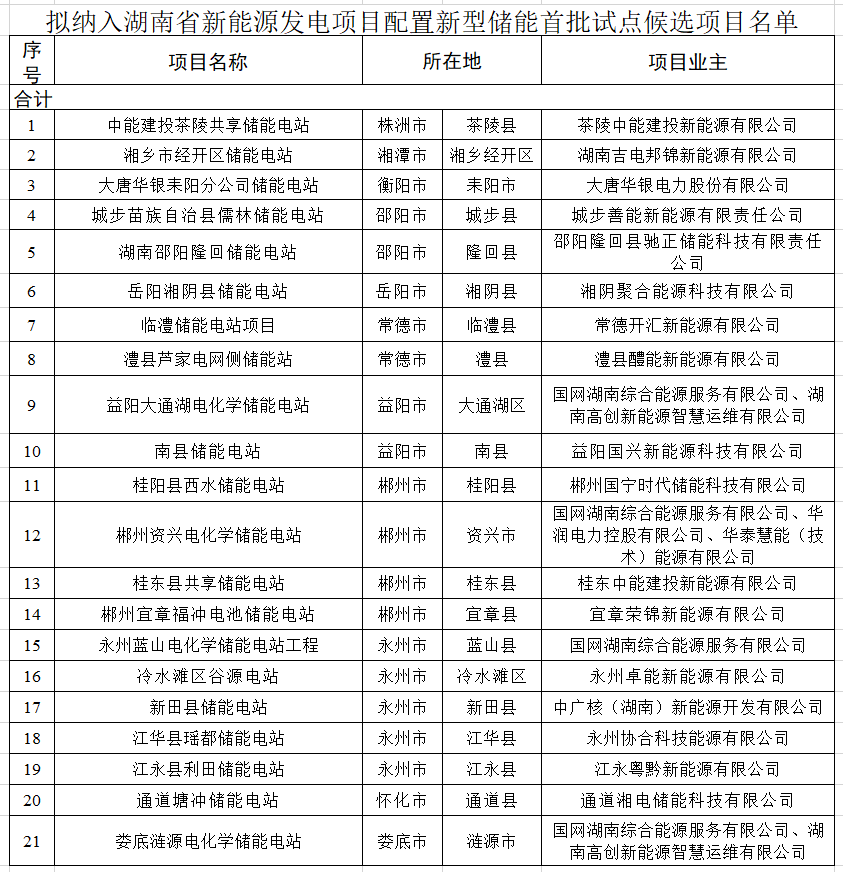 10月10日,湖南省发改委公示了《拟纳入湖南省新能源发电项目配置新型储能首批试点候选项目名单》,共21个项目。根据之前的要求: