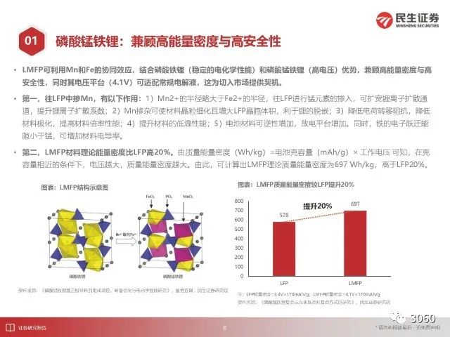 关注磷酸锰铁锂的起底逻辑:第一,现有磷酸盐系正极材料( LiMPO4 ,M可由Fe、Mn、Co、Ni等元素组成)存在应用瓶颈,上升空间有限。1)磷酸钴锂(4.8V)和磷酸镍锂(5.2V)充放电平台过高,难以被商业化应用。2)LFP电压平台仅为3.4V,能量密度已接近理论上限;磷酸锰锂高达4.1V,但电导率和锂离子扩散速率极低,被视为“绝缘体”。第二,磷酸锰铁锂(M−)兼顾高能量密度和高安全性,可缓解LFP量密度短板。由质量能量密度(Wh/kg)=电池克容量(mAh/g) 工作电压 (V),可计算出LMFP(4.1V)理论质量能量密度为697 Wh/kg,高出LFP20%。由此,往LFP中掺Mn是磷酸铁锂在电化学材料体系端提高能量密度的“唯一“进化之路。