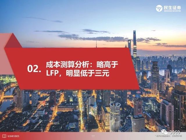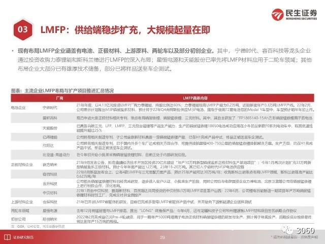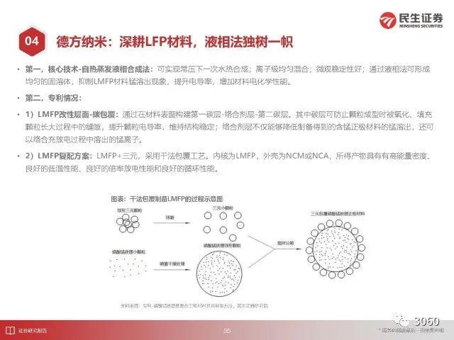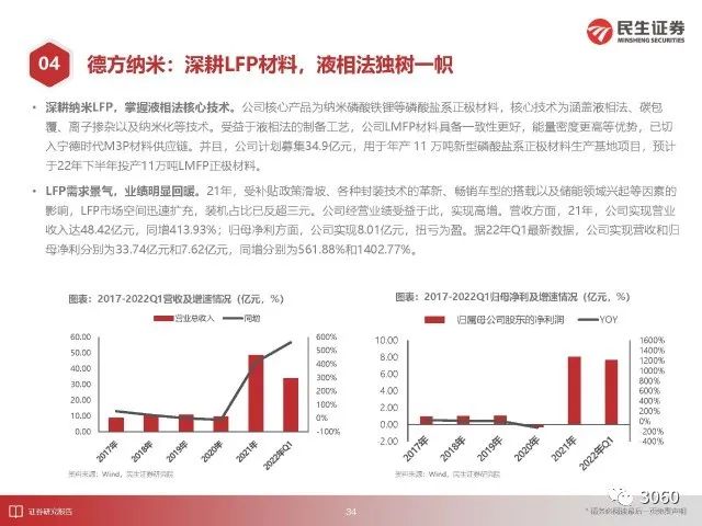 深耕纳米LFP,掌握液相法核心技术。公司核心产品为纳米磷酸铁锂等磷酸盐系正极材料,核心技术为涵盖液相法、碳包 覆、离子掺杂以及纳米化等技术。受益于液相法的制备工艺,公司LMFP材料具备一致性更好,能量密度更高等优势,已切 入宁德时代M3P材料供应链。并且,公司计划募集34.9亿元,用于年产 11 万吨新型磷酸盐系正极材料生产基地项目,预计 于22年下半年投产11万吨LMFP正极材料。