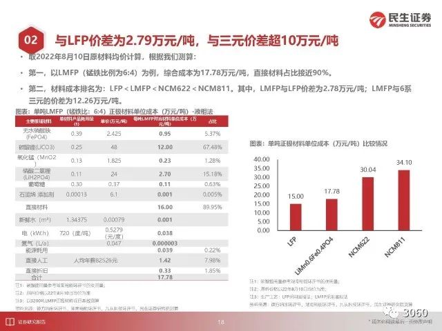 取2022年8月10日原材料均价计算,根据我们测算:第一,以LMFP(锰铁比例为6:4)为例,综合成本为17.78万元/吨,直接材料占比接近90%。第二,材料成本排名为:LFP<LMFP<NCM622<NCM811。其中,LMFP与LFP价差为2.78万元/吨;LMFP与6系 三元的价差为12.26万元/吨。