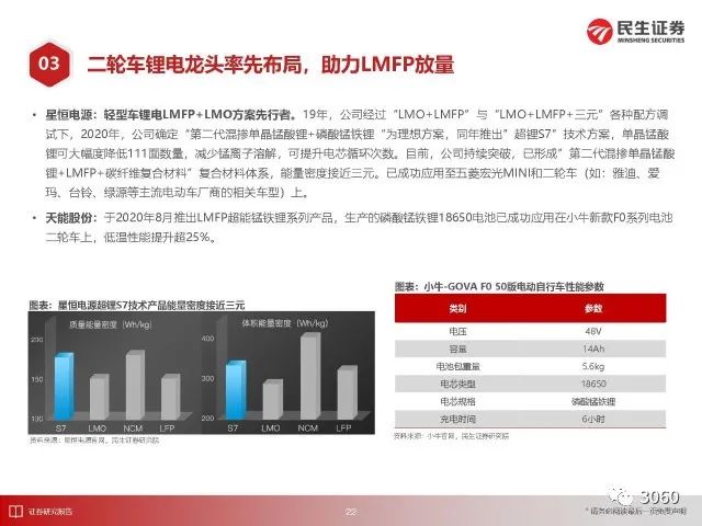 星恒电源:轻型车锂电LMFP+LMO方案先行者。19年,公司经过“LMO+LMFP”与“LMO+LMFP+三元”各种配方调 试下,2020年,公司确定“第二代混掺单晶锰酸锂+磷酸锰铁锂“为理想方案,同年推出”超锂S7”技术方案,单晶锰酸 锂可大幅度降低111面数量,减少锰离子溶解,可提升电芯循环次数。目前,公司持续突破,已形成”第二代混掺单晶锰酸 锂+LMFP+碳纤维复合材料”复合材料体系,能量密度接近三元。已成功应用至五菱宏光MINI和二轮车上。