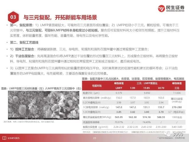 第一,复配原理:1)LMFP表面能较大,可吸附在三元表面形成包覆层;2)LMFP粒径小于三元,颗粒较细,可填充于三 元空隙中。与三元复配,可弥补LMFP材料本身粒度过小的短板。复合后可实现材料间大小粒径互相搭配,提升正极材料压 实密度、体积能量密度、循环性能、容量性能、导电性以及电化学性能。第二,复配工艺路线。