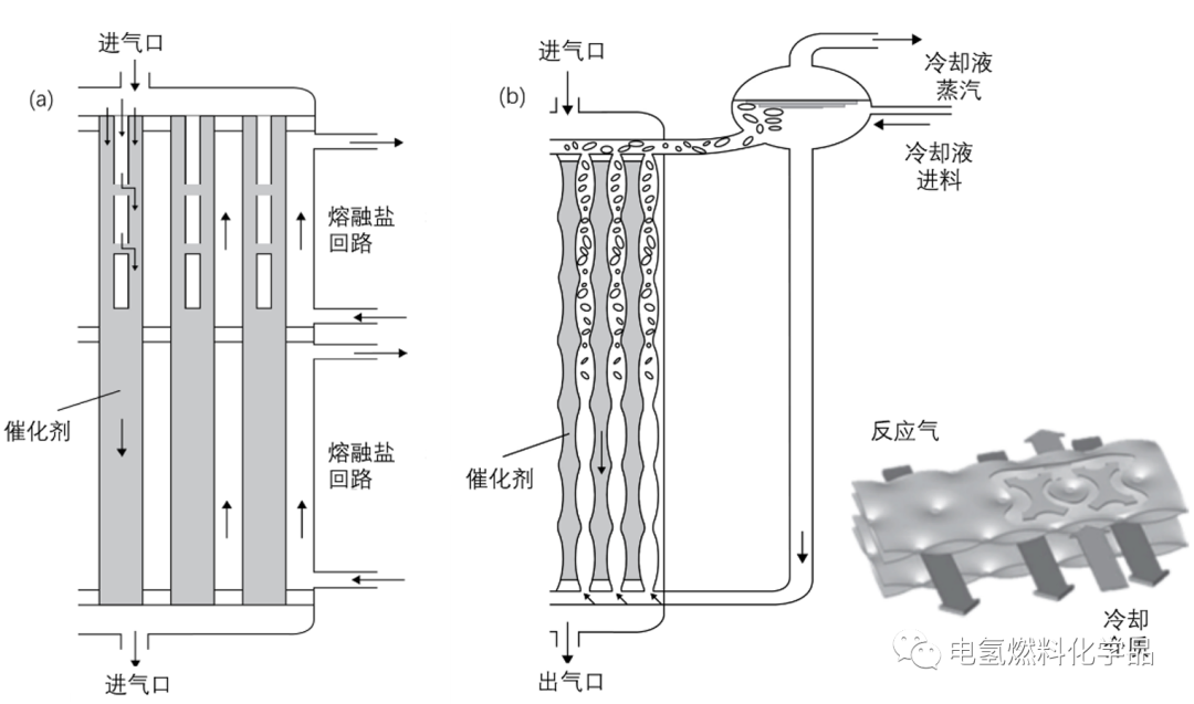 德国巴登-符腾堡州太阳能与氢能研究中心ZSW设计了2种用冷却式等温固定床反应器,分别是熔融盐冷却的列管式固定床和沸腾水冷却的板式固定床反应器(molten salt‐cooled tube bundle reactor,water/steam‐cooled plate reactor)。
