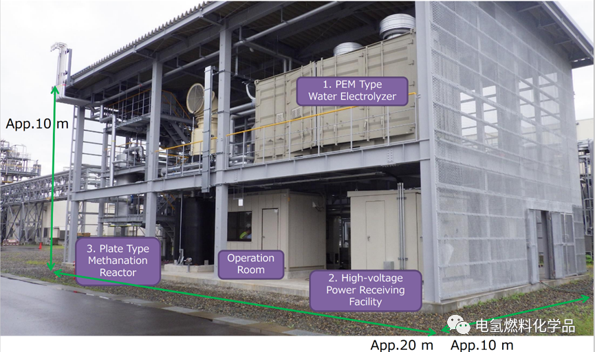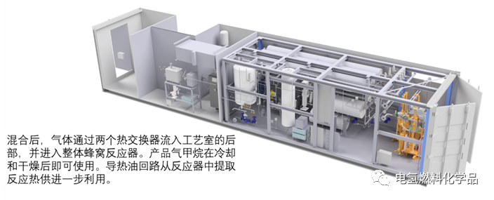 2019年, Hitachi,INPEX 和NEDO合作完成了8Nm3/h甲烷产能装置的开工,如下图。氢气由PEM电解水装置提供,也跟ZSW一样采用高效移热的板式反应器,换热器壳体温度238oC,产品气的甲烷浓度高达96% ,床层最高温度在550℃以下,反应热回收效率85%以上,短周期反复启停操作对装置没有影响。NEDO公司的目标是2030年代实现甲烷化的商业化(60,000 Nm3/h,对应年减CO2一百万吨)。