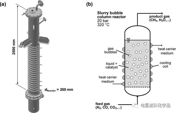 KIT于2011年到2014年参与了SEE项目(Storage of electric energy from renewable sources in the natural gas grid– water electrolysis and synthesis of gas components),该项目的主要任务是对比实验室级别的固定床和浆态床甲烷化工艺和考察电解水系统(PEM)的动态响应。2019年,做为KIT Energy Lab 2.0项目的一部分,KIT开发的浆态床CO2甲烷化装置投入中试,规模约为100 kW SNG(约200kW电解槽)。反应器直径约25厘米,总高度约3米,将在不同技术条件下运行(如原料气为临近生物质气化厂的合成气、模拟PTM高度波动的负荷等)并获取可靠数据供分析。中试装置调试和首次动态甲烷化试验于2019年6月顺利完成。2019年8月,进一步进行了静态和动态操作试验。通过设置不同的原料气组成和进料负荷,研究了该反应器与下游液化装置联用对CO2转化率的影响。浆态床反应器示意图如下。