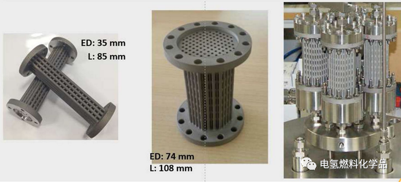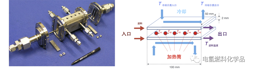 法国CEA Liten开发了的毫米通道反应器,全名是“Milli-channel HEX reactors”,毫米通道换热反应器;不知道跟“毫米通道”关系更大还是跟“换热”关系更大,不懂。原型反应器包含20个纵向平行反应通道,反应通道上下两层设有横向的循环热导油冷却通道。反应器组件采用高温高压(约1000℃、1000bar)的热等静压扩散焊接工艺。DUCHAMP Julien. Design and optimization of special structure heat exchanger for regeneration and energy storage of carbon dioxide hydrogenation to synthetic methane [D]. Strasbourg: University of Strasbourg, 2015.