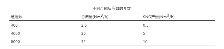 2014年,西班牙Tecnalia R&I公司开发了388通道的毫米通道反应器,并在RENOVAGAS项目中成功示范应用。该项目采用镍/钌/Al2O3催化剂,甲烷产能为0.5 Nm3/h。进一步放大后的反应器参数如下表所示。多通道反应器在相同反应条件下的CO2转化率和CH4选择性均明显高于固定床。