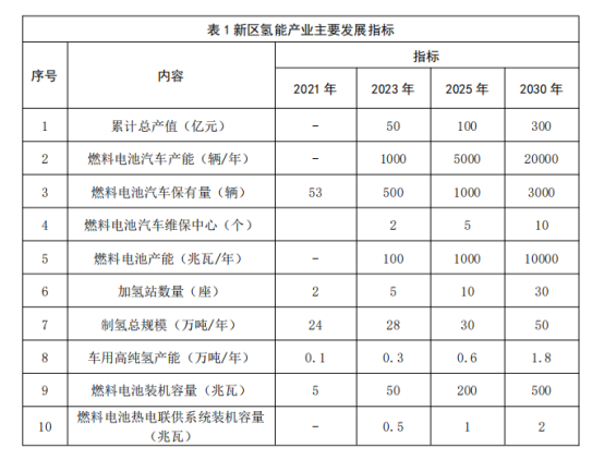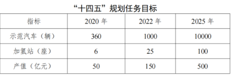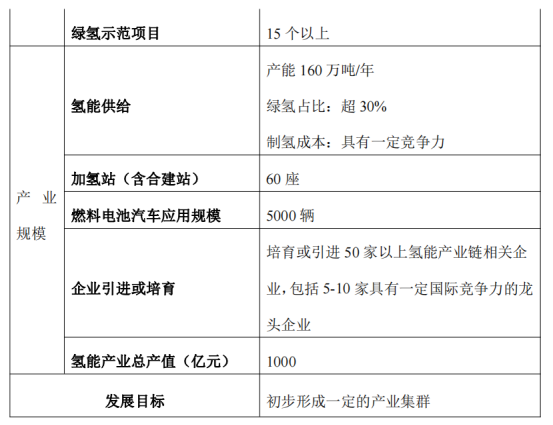 推广示范燃料电池车辆不少于1000 辆,建设加氢站不少于 10 座,分布式能源、热电联供及备用电源应用不少于100套、氢能船舶1-3艘、氢能无人机不少于100架。