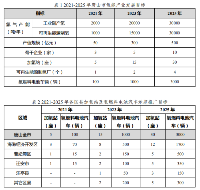 至2025年,全市氢能产业链实现产值规模150亿元,减少碳排放30万吨,集聚20 家以上氢能产业相关企业,重点扶持培育氢能相关龙头企业8家以上,具有自主知识产权和核心技术的燃料电池发动机产能达5000台/年,燃料电池汽车达到2000辆/年的生产规模。至2025年,建成加氢站(或油氢电综合能源站)10座以上,将燃料电池公交、重卡、物流等车辆进行初步应用示范,逐步扩大燃料电池重卡、公交、公务车、物流车、乘用车、环卫车、皮卡车的应用示范,累计推广燃料电池车辆1330辆。建成两区两线(海港经济开发区和迁安市两个氢能示范区、迁曹线、唐港线两条氢燃料电池汽车示范线)示范区域,建成加氢站 30 座以上,氢燃料电池汽车运营数量达到 3000 辆以上,其中氢能重卡不少于2000 辆。
