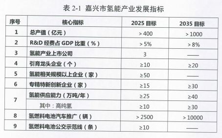 第一阶段目标(近期2021-2025):到2025年,氢能产业总产值超过 400 亿元,企业 R&D 经费占销售额的比重不低于5%;创建市级及以上重点实验室2家,国家高新技术企业数突破5家,市级及以上企业技术中心超过5家;力争引进和培育一批国内外有影响力的氢能龙头企业,培育氢能上市公司3家以上,引育氢能龙头企业10家以上,氢能相关规模以上企业数量突破50家,培育专精特新创新企业不少于15家。氢能供应能力25万吨/年以上(其中高纯氢及燃料电池用氢10万吨/年以上),力争建成加氢站30座,其中固定式加氢站20座以上,初步建成面向长三角区域的氢能供应基地。全市运用氢燃料电池汽车数童突破 2500 辆,其中氢燃料公交车、物流车占比达到85%以上,打造10条以上氢燃料电池公交示范线,并开展氢能环卫车、氢能观光车、氢能船舶、氢能叉车、燃料电池分布式发电等试点应用。