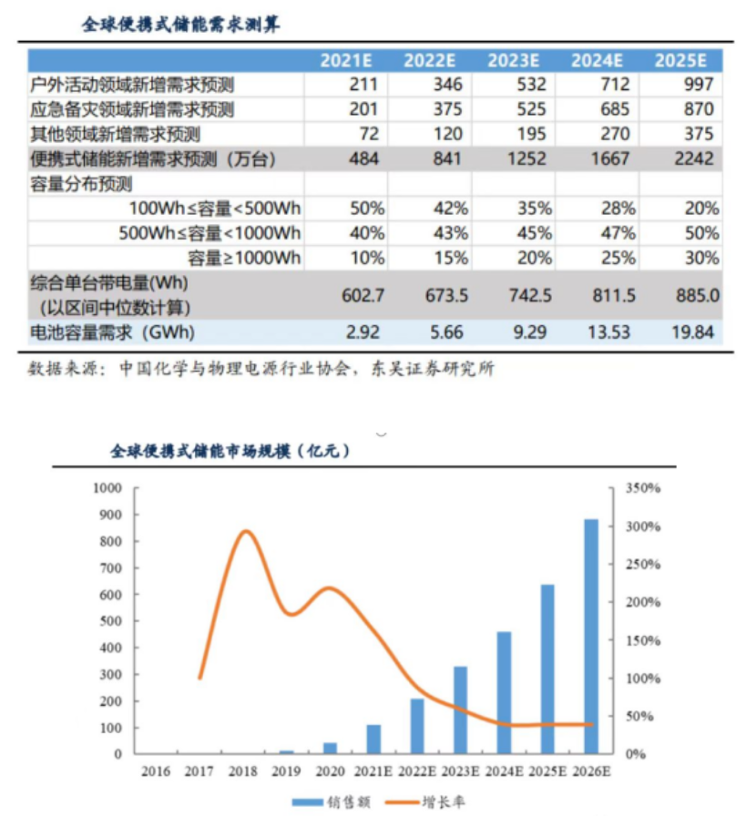 根据中国化学与物理电源行业协会数据测算,2022年全球便携式储能出货量将达840.8万台,对应电池容量需求5.66GWh,市场规模达208.1亿元,预计到2025年,全球便携式储能出货量将达2242万台,对应电池容量需求19.84GWh,市场规模达636.2亿元,复合增速分别为 39%/52%/45%,需求增长迅速。