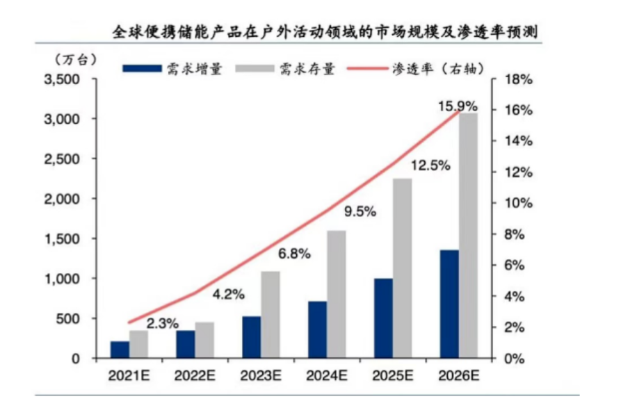 据数据测算,过去4年里,便携储能市场规模增长了23倍,预计2026年户外活动领域对便携储能产品的购置需求将达1355万台,场景渗透率可达15.9%。