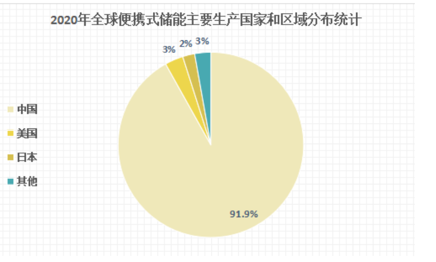 2020年,中国便携式储能产品产量就占全球比例达到了91.90%,美国、日本分别位列二、三,但与中国之间的差距明显。