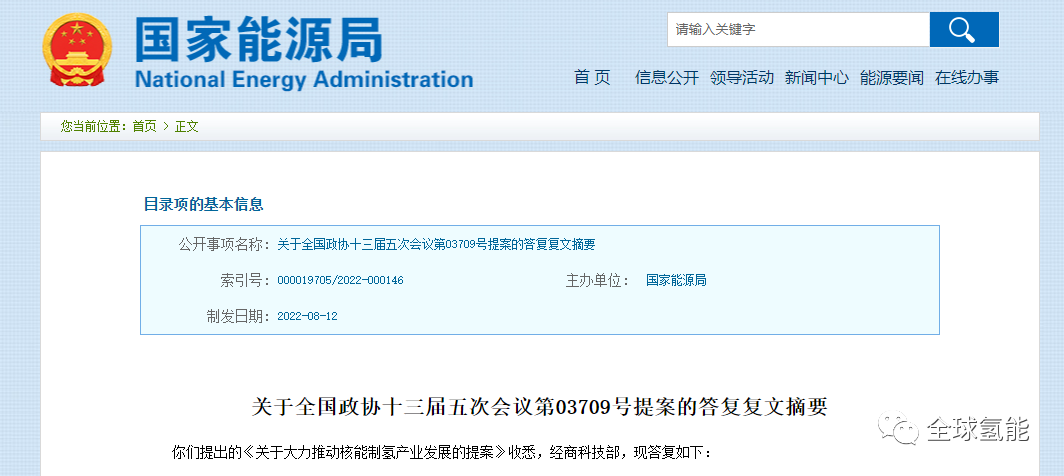 我国氢能发展处于初期,自2019年《政府工作报告》首次写入氢能源后,各大央企从氢能基础设施建设、关键技术研发、产品推广应用等场景积极布局。今年8月12日,国家能源局在《关于全国政协十三届五次会议第03709号提案的答复复文摘要》中对《关于大力推动核能制氢产业发展的提案》做出回复,文件中提到核能制氢内容如下: