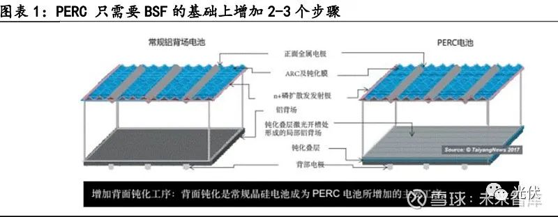 通过复盘光伏电池技术的发展,近年来行业发生的一次大的变化就是,PERC替代的 BSF电池,2016年下半年开始,PERC为代表的一批高效电池技术涌现,PERC电池结构是 从常规的铝背场电池(BSF)结构自然衍生而来,BSF电池具有先天的局限性,应用于常 规BSF电池背表面的金属铝膜层中,达到铝背层的红外辐射光,只有60-70%能被反射回 去,通过在背面附上介质钝化层,可大大减少光电损失,仅仅对背面进行优化,降低光伏电池背面的复合损失。PERC生产相对容易实施,只需要在BSF常规流程上增加2-3个步骤即可。
