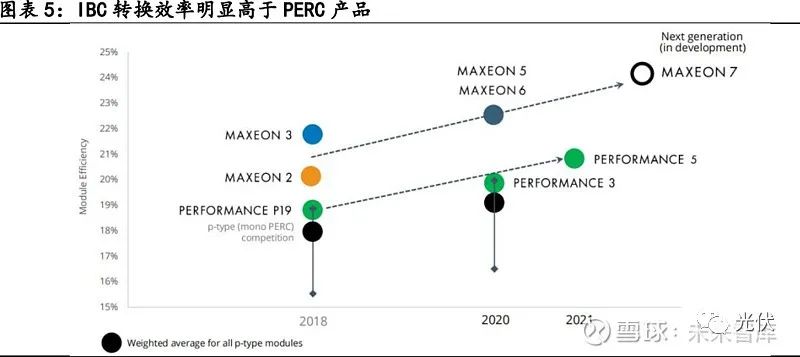 Sunpower目前已经转型为EPC和开发,组件制造已经以Maxeon品牌独立运营,Maxeon品牌28.8%的股权被中环股份认购。目前Maxeon并未在中国大规模销售,主要针 对于欧洲、中东、非洲和澳大利亚等市场,目前Maxeon 分两个产品线,一是Maxeon 系 列产品,采用IBC的技术路线,二是Performance的产品,采用高效PERC单晶的产品,目 前IBC产品效率明显高于Performance产品。