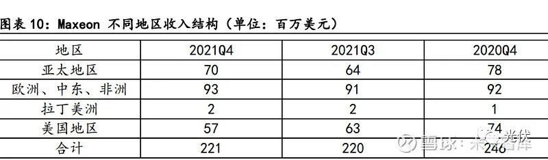 从公司出货量来看,2021Q4 IBC产品出货214MW, Performance 产品出货363MW。Maxeon 2021Q4 实现收入2.2亿美元,其中1.84亿美元来自于屋顶光伏,屋顶光伏中有 1.05亿美元收入来自于IBC产品,0.79亿美元收入Performance产品。0.38亿收入来自于 集中式电站,其中0.32亿元收入来自于Performance,其余为IBC产品,我们可以根据不 同应用场景收入以及总出货量计算出IBC产品与P型PERC产品的均价分别为0.514美元 /W、0.305美元/W,两者之间具有明显价格差异,一部分原因由于公司部分IBC产品收入 来自于美国高价市场,公司25.7%收入来自于美国市场,另一部分原因是两者之间不同 应用场景及效率带来价差。Maxeon一季度预计出货量为475-495MW,收入为2.1-2.2亿美元,公司一季度预计调 整后EBITDA 为亏损0.28-0.34亿美元,出货单价约为0.44美元/W,环比进一步提升,预 计IBC出货量占比提升,在海外的分布式市场,高效产品将维持在高价。