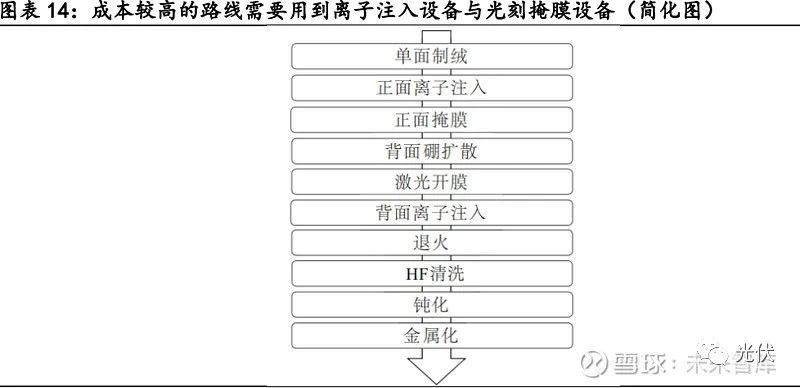 经典IBC的生产步骤是较为复杂,其中背面 p/n 交替的叉指状结构的形成是 IBC 太阳电池的核心技术,传统的工艺需要采用半导体常用的精度更高、均匀性更好的离子 注入设备,同时需要光刻掩膜工艺设备,成本较高。按照经典IBC需要17步工艺,过程 相对复杂。