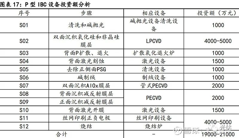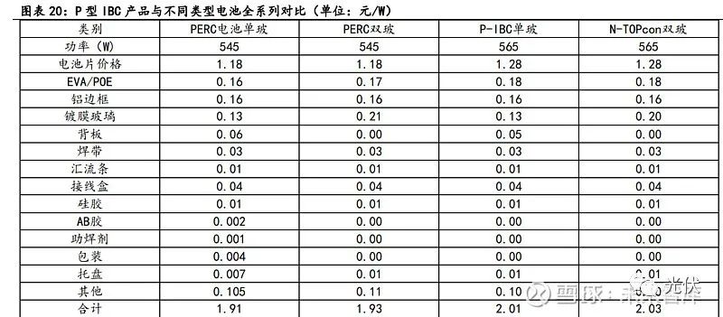 根据我们的测算,P型IBC电池在设备折旧上相比于P型PERC电池高约0.01元/W,在 金属化上由于其同样采用高温工艺,同时使用银浆和铝浆,其金属化成本与PERC 基本 接近,根据我们测算当其良率在95%的时候,P型IBC电池相比于PERC成本高0.04元/W,当良率与达到98%的时候,P型IBC电池相比于P型PERC成本高约0.01元/W。