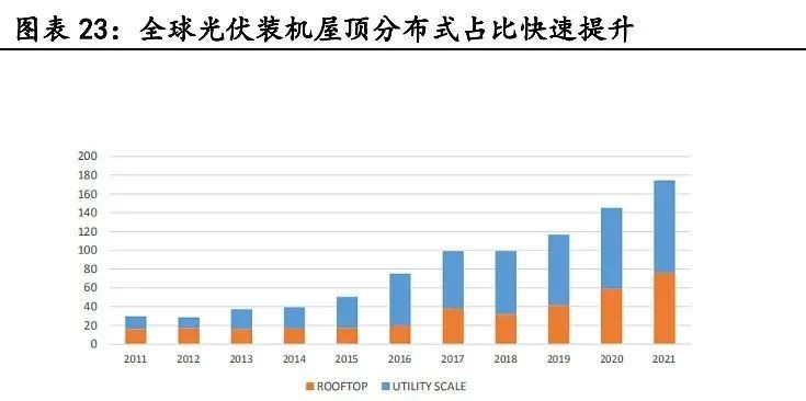 屋顶分布式光伏2021年快速增长,主要增长来自于中国、美国、德国、西班牙等国 家,其中西班牙屋顶分布式2021年比于2020年增长100%,分布式光伏占比逐年提升,2021年全球新增装机中分布式占比约45%。2022年欧洲分布式光伏市场快速发展,主要 原因是各国政府基于能源独立考虑实施的鼓励政策以及持续上涨的PPA电价。德国、荷 兰、波兰等欧洲国家分布式装机快速增长,巴西小型光伏市场也快速增长,根据 BloombergNEF统计,其小型光伏2022年将实现装机9.0GW,同比增长80%。分布式光伏预 计将成为全球光伏增长装机重要动力,IBC在高端分布式和BIPV市场具有竞争力。