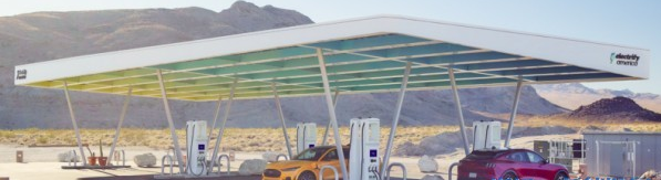 Baker的新的兆瓦级BESS与EA太阳能顶棚(如图)相结合,在管理能源成本方面比Electrify America最初的BESS系统更进一步。当本地公用事业公司限制充电站从电网获取的电量时,这种大电池还可以作为一个缓冲器为充电站补充电力,从而减轻当地电网的压力。