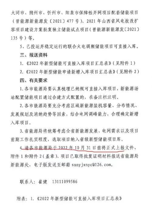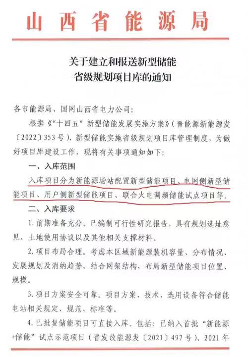近日,山西省能源局下发《关于建立和报送新型储能省级规划项目库的通知》。入库项目分为新能源场站配置新型储能项目、电网侧新型储能项目、用户侧新型储能项目、联合火电调频储能试点项目等。其中,已批复储能项目可直接入库,包括:已纳入首批“新能源+储能“试点示范项目(晋发改能源发(2021)497号)、2021年大同市、朔州市、忻州市、阳泉市保障性并网项目配套储能项目(晋能源新能源发(2021)477号)、2021年山西省风电技改扩容项目建设方案批复独立储能试点项目(晋能源新能源发(2021)135号)等;已投运并稳定运行的联合火电调频储能项目可直接入库。
