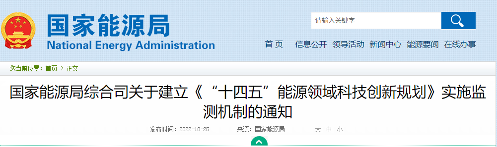 10月25日,国家能源局发布关于建立《“十四五”能源领域科技创新规划》实施监测机制的通知。通知》指出,发布《规划》任务榜单,按照“揭榜挂帅”、自愿申报的原则,广泛征集《规划》任务实施依托项目及能源领域其他相关重大科技创新项目,并建立集中攻关、示范试验实施监测项目库。健全实施监测项目信息报送、定期评估和动态调整机制,确保能源领域科技创新任务“攻关有主体、落地有项目、进度可追踪、动态化调整”。