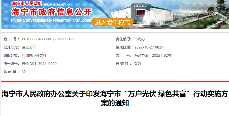 海宁市人民政府办公室关于印发海宁市“万户光伏 绿色共富”行动实施方案的通知