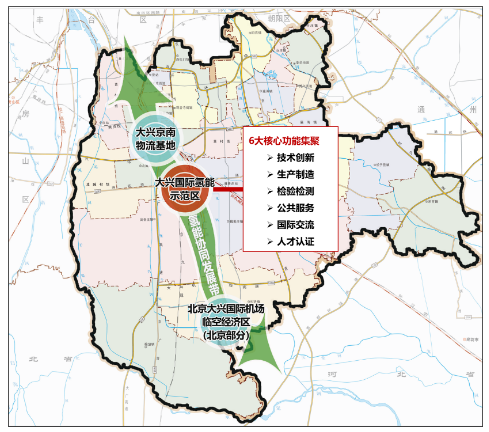 以占地2平方公里的大兴国际氢能示范区为核心承载,依托示范区实现技术攻坚研发、先进生产制造、综合检验检测、公共生活服务、国际交流峰会和国际人才认证等综合性功能,为企业提供便捷高效、功能集聚、舒适宜人的产业发展环境;以京南物流基地和北京大兴国际机场临空经济区两大区域,作为国际氢能示范的重要“两翼”,持续打造优质高质量的氢能产业应用示范试点,最终实现“一核引领、两翼联动”的产业发展空间格局。