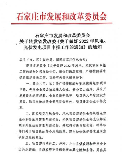 11月7日,河北省石家庄市发改委印发《关于做好2022年风电、光伏发电项目申报工作的通知》,要求项目需按期开工、并网,并由县级政府和开发企业出具承诺函;县级政府不得强制增加其它附加条件,并出具承诺函。