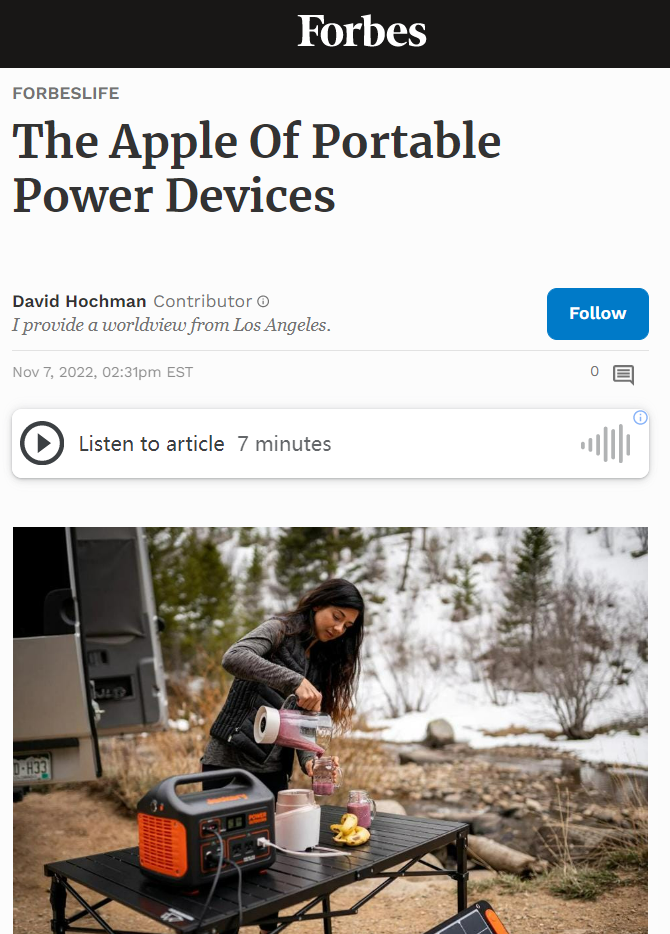 11月8日,全球著名财经杂志《福布斯》发表题为《The Apple Of Portable Power Devices》的文章,对华宝新能旗下便携储能品牌Jackery电小二强大的功能表示称赞,并将其比喻为便携储能行业的“苹果”。