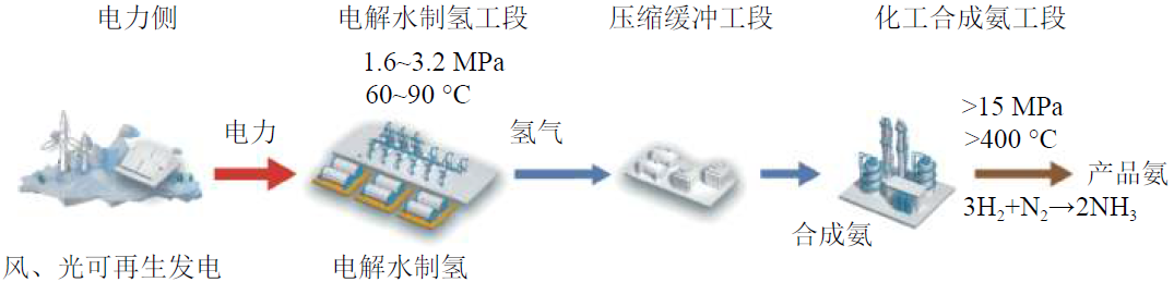 合成氨已有一百多年发展历史,氨的生产、储运及使用已形成了完备的产业链、行业标准及安全规范。合成氨包括灰氨、蓝氨、绿氨3种合成工艺。灰氨合成工艺指由天然气蒸汽重整氢气及空气分离的氮气再通过传统哈伯法合成氨,该工艺已沿用上百年,但其高温高压条件造成巨大能耗,且伴随大量CO2温室气体排放。蓝氨合成工艺与灰氨基本相似,但会对工艺流程进行碳捕集与封存。绿氨合成工艺主要指全程以可再生能源为动力开展的电解水制氢及空气分离制氮再通过哈伯法制氨。