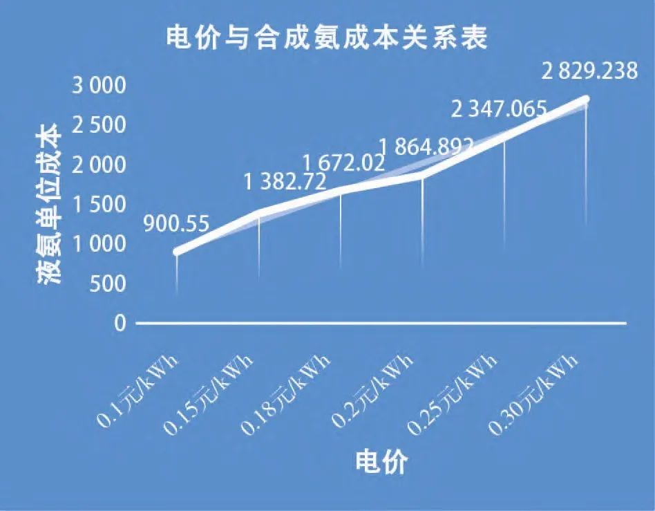 影响合成氨生产成本主要因素是电价。当电价为0.3元/kWh时,“绿氨”生产成本是2829元/t,加上运输成本(每吨约270元),刚好与液氨市场价3100 元/t持平。如采用可再生能源的“四弃”,电价为0.1元/kWh时,经济效益可达到近2000元/t的利润。