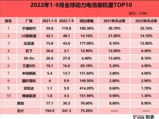 而从前三季度的数据来看,今年1-9月全球动力电池装机量为341.3GWh,同比上升75.2%。其中,宁德时代装机量达到119.8 GWh,同比增长100.3%,市占率也从30.7%增长至35.1%。LG新能源装机量为48GWh,同比增长14.1%,市占率相比去年同期下降7.5个百分点。比亚迪的装机量43.6GWh,逼近LG新能源,市占率从8.1%提升至12.8%。