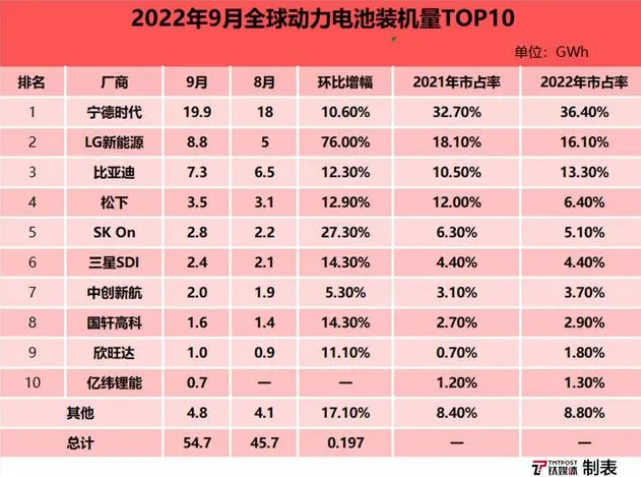 有意思的是,从去年开始,宁德时代、LG新能源和松下分别代表“中韩日”位列前三的格局已经悄然发生了转变。取而代之的则是宁德时代、LG新能源和比亚迪“三分天下”的局面。从数据也可以看到,松下在9月的市占率再次下降了5.6个百分点,3.5GWh的成绩尚不足比亚迪的一半,而TOP10中也仅有松下一家日系企业上榜。