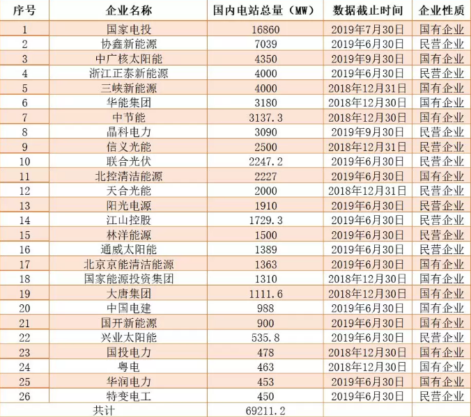 从下表统计的企业来看,国有企业累计电站持有量为40820MW、民营企业累计电站持有量为28390MW,国企规模略高。但很明显,经历2019年之后,这样的情况将发生较大的变化。