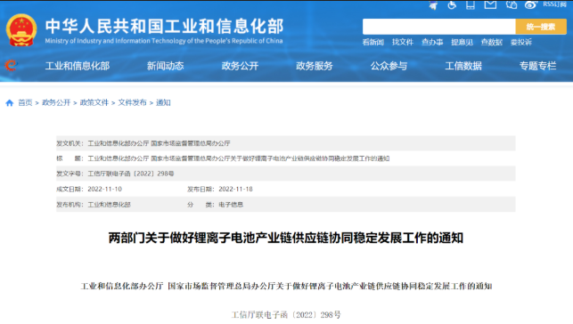 【DT新材料】获悉,11月18日,工信部、国家市场监督管理总局办公厅发布《关于做好锂离子电池产业链供应链协同稳定发展工作的通知》。