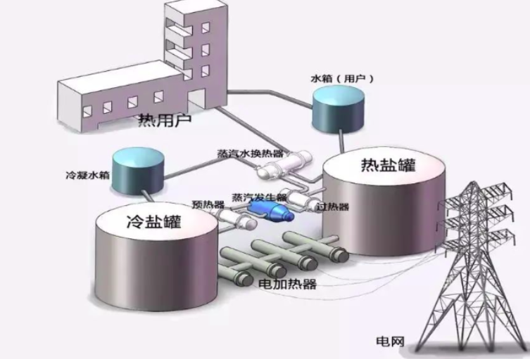 熔盐储热技术是通过用光热、风电、光伏、夜间低谷电、工业废热等加热熔盐来存储可再生能源或低谷电能。随后,在有用能需要时通过与水换热,产生热水或水蒸汽直接供热,或利用水蒸气驱动涡轮机工作对外发电。
