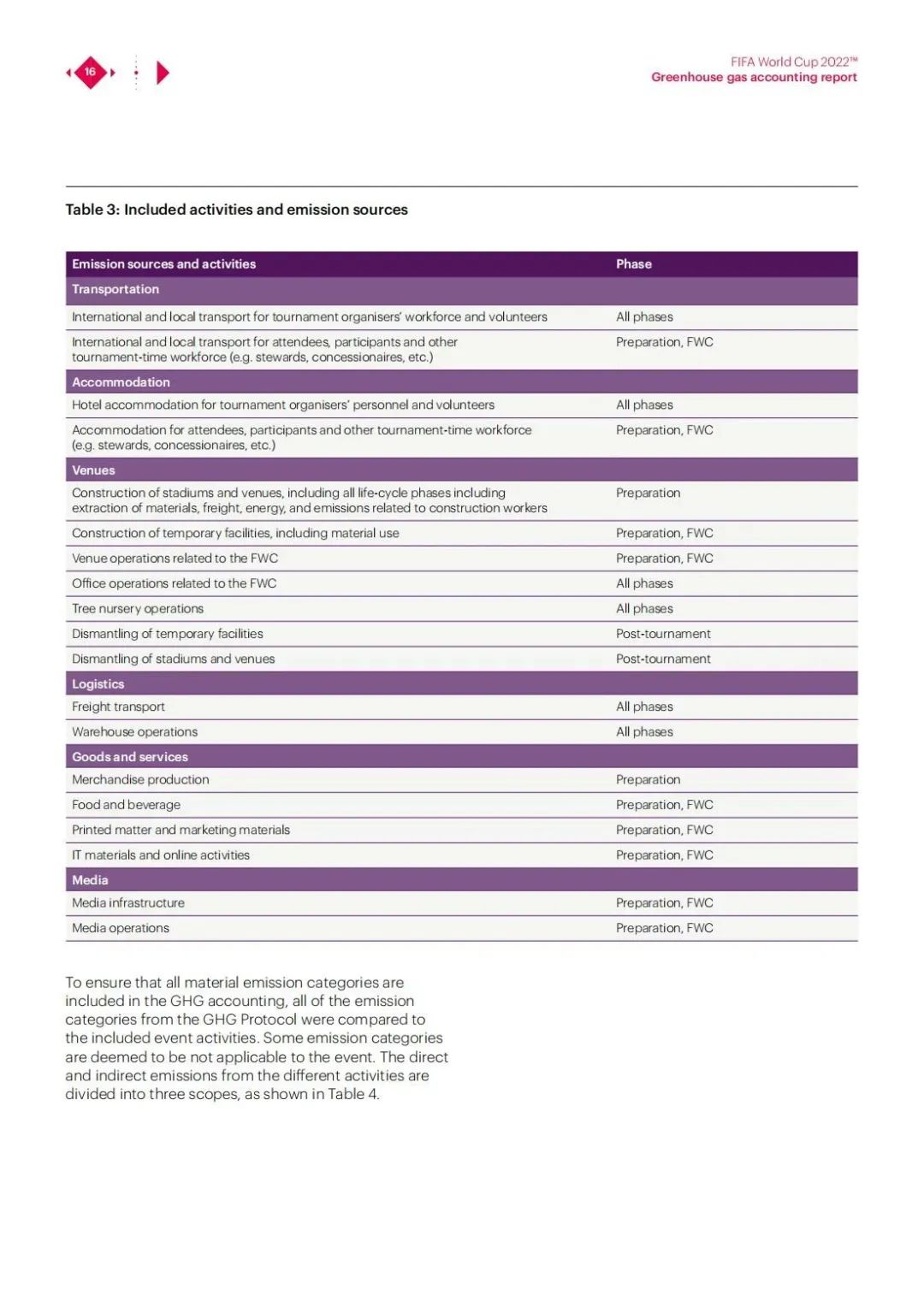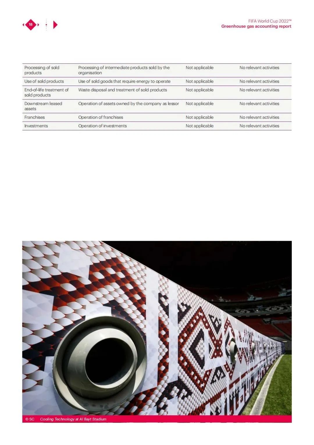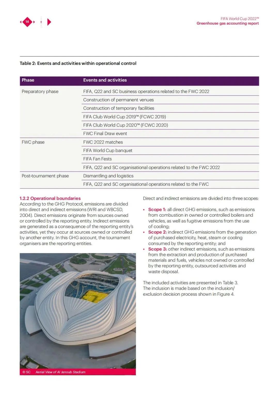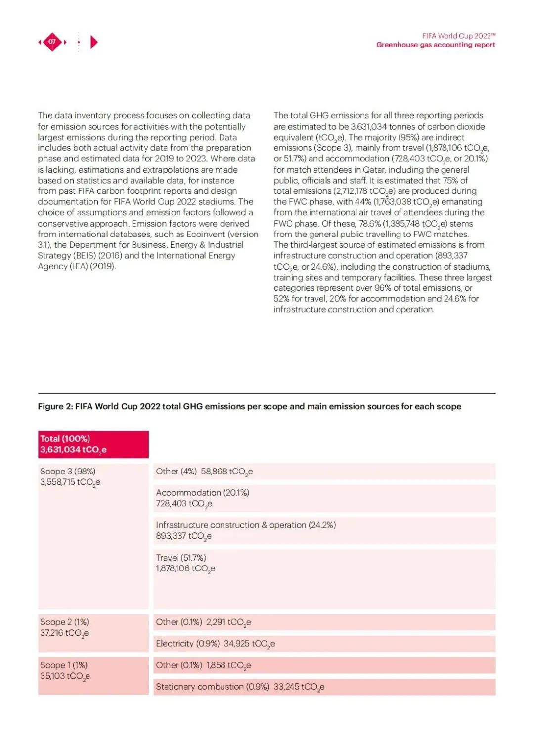 11月21日,卡塔尔世界杯开幕,2021年,国际足联对外发布了《卡塔尔世界杯温室气体核算报告》。报告显示,从2011年4月至2023年6月的筹备、赛事和赛后三个阶段,本届世界杯报告期温室气体排放总量估计为363万吨二氧化碳当量。其中大部分(98%)是间接排放(范围3,356万吨二氧化碳当量),主要来自于卡塔尔的比赛参加者,包括普通公众、官员和工作人员的旅行。