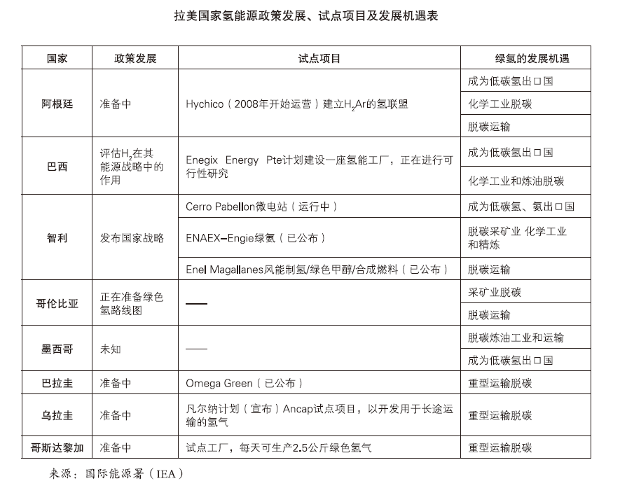 在氢能领域,拉美各国的发展情况和未来规划处于不同阶段。阿根廷、巴西、智利和哥伦比亚均发布了氢工业战略,希望在未来几年成为低碳氢出口国。墨西哥、巴拉圭和乌拉圭寻求使用氢能来使工业和交通脱碳,但尚未制定发展该行业的政治战略。除了公共部门以外,私营部门也参与其中,例如阿根廷的H2Ar财团和智利的H2Chile。
