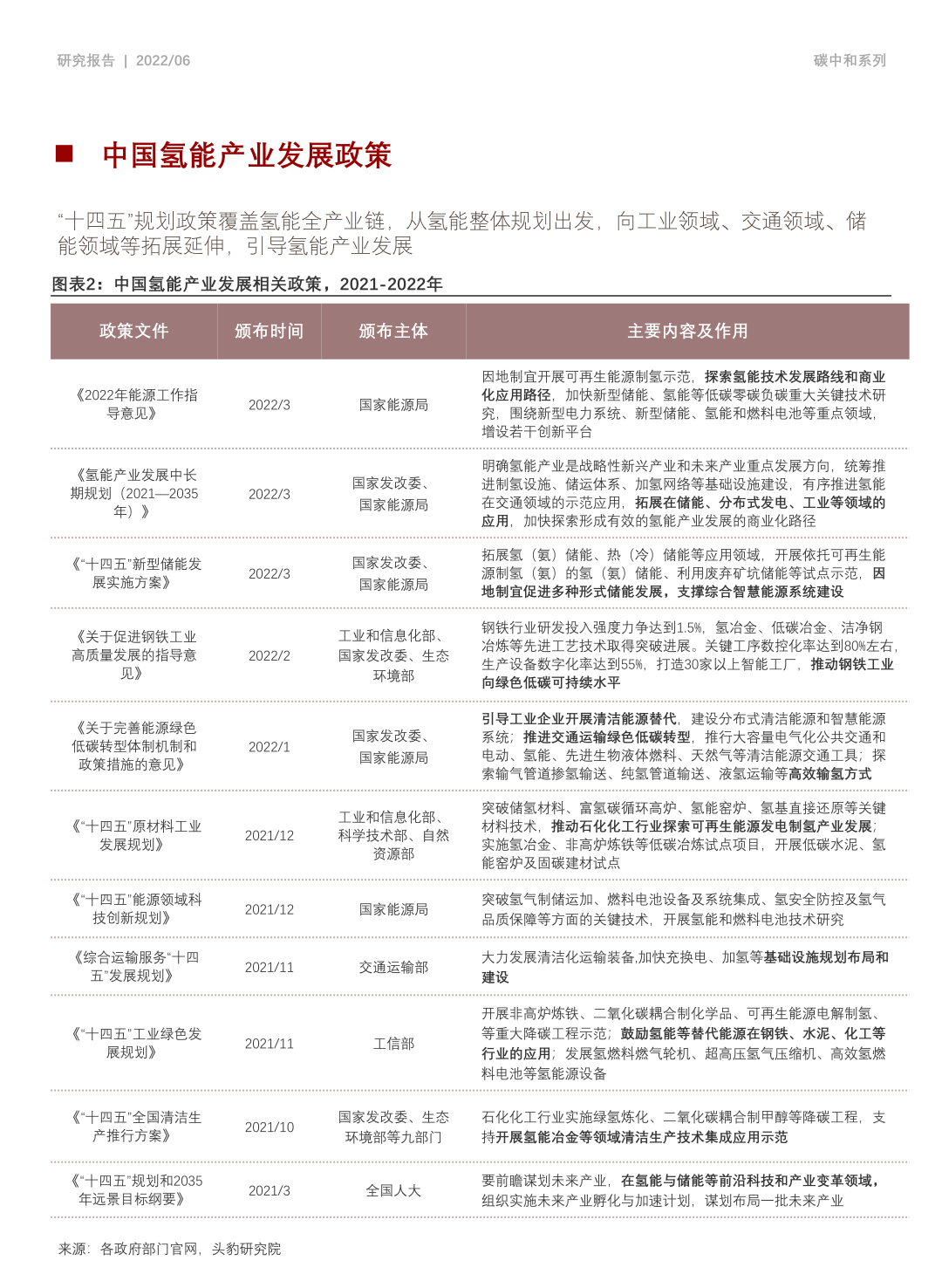 目前中国已成为世界第一制氢大国,2020年氢能产量和消费量均已突破2,500万吨。国家“十三五”科技创新规划就指出,氢能是新一代引领产业变革的颠覆性能源技术;在“十四五”规划纲要中,将氢能与类脑智能、量子信息、基因技术、未来网络、深海空天开发等前沿科技,共同列为六大未来产业,氢能成为国家能源转型的重大战略方向之一。