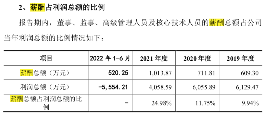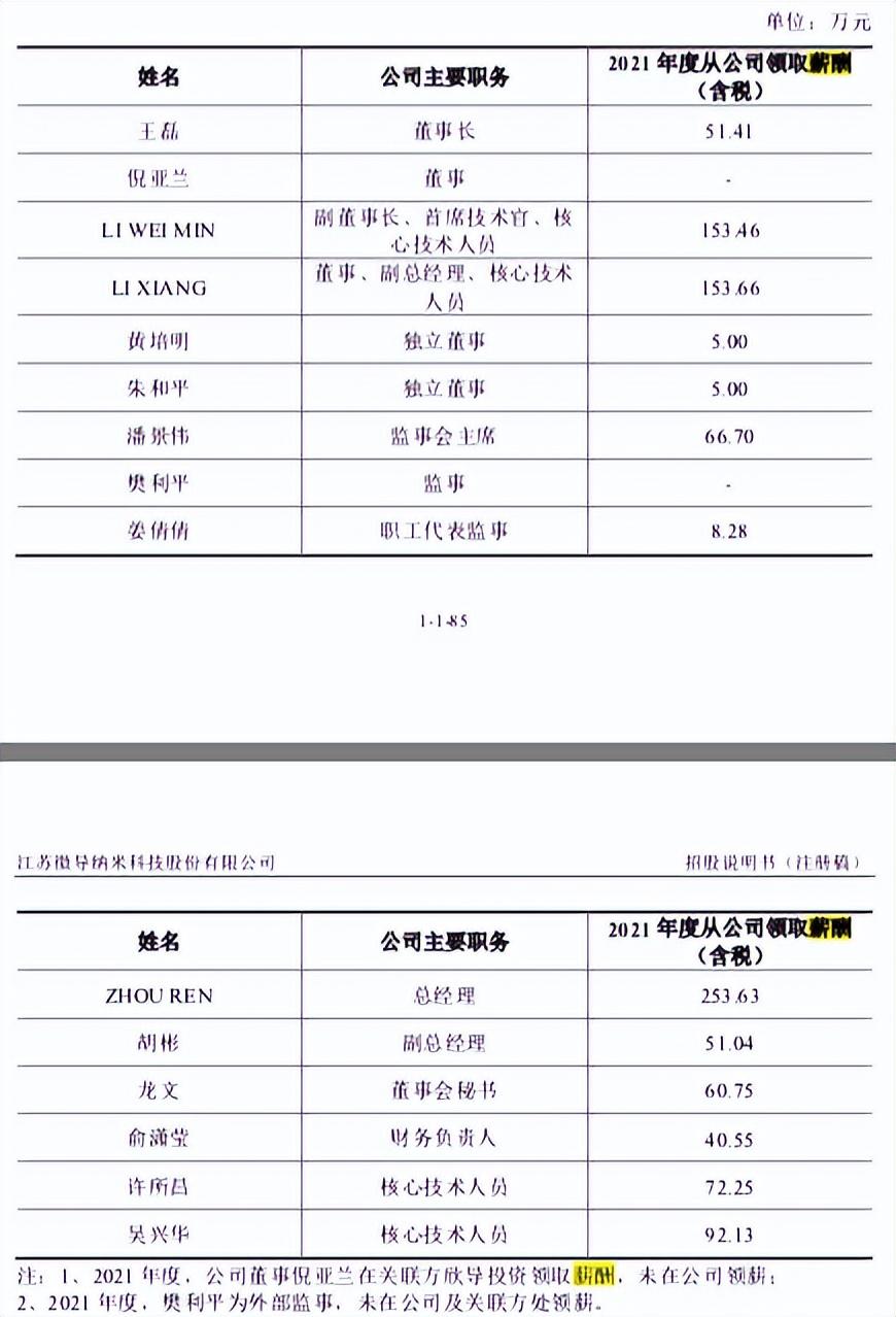 报告期内,微导纳米的董高监及核心技术人员的薪酬总额为609万元、711万元、1013万元和520万元,占利润总额的比例迅速提高,2021年已占25%。其中董事会秘书、总经理、副总经理、首席技术官的2021年年薪均高于董事长。