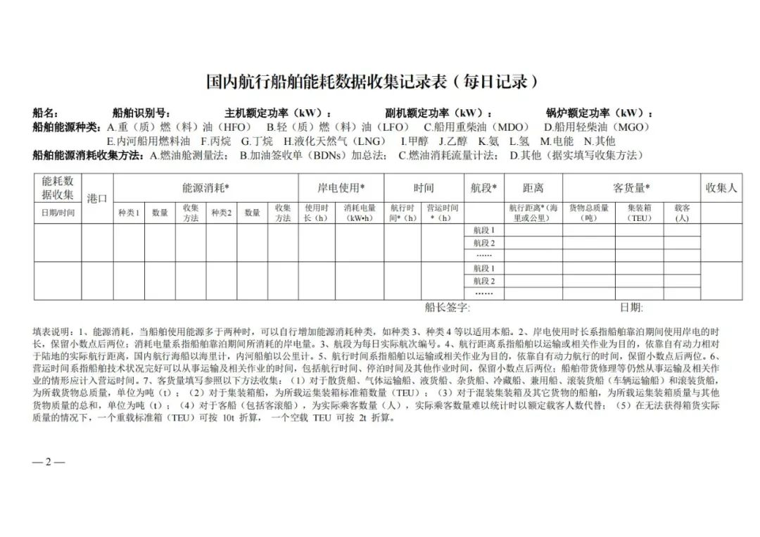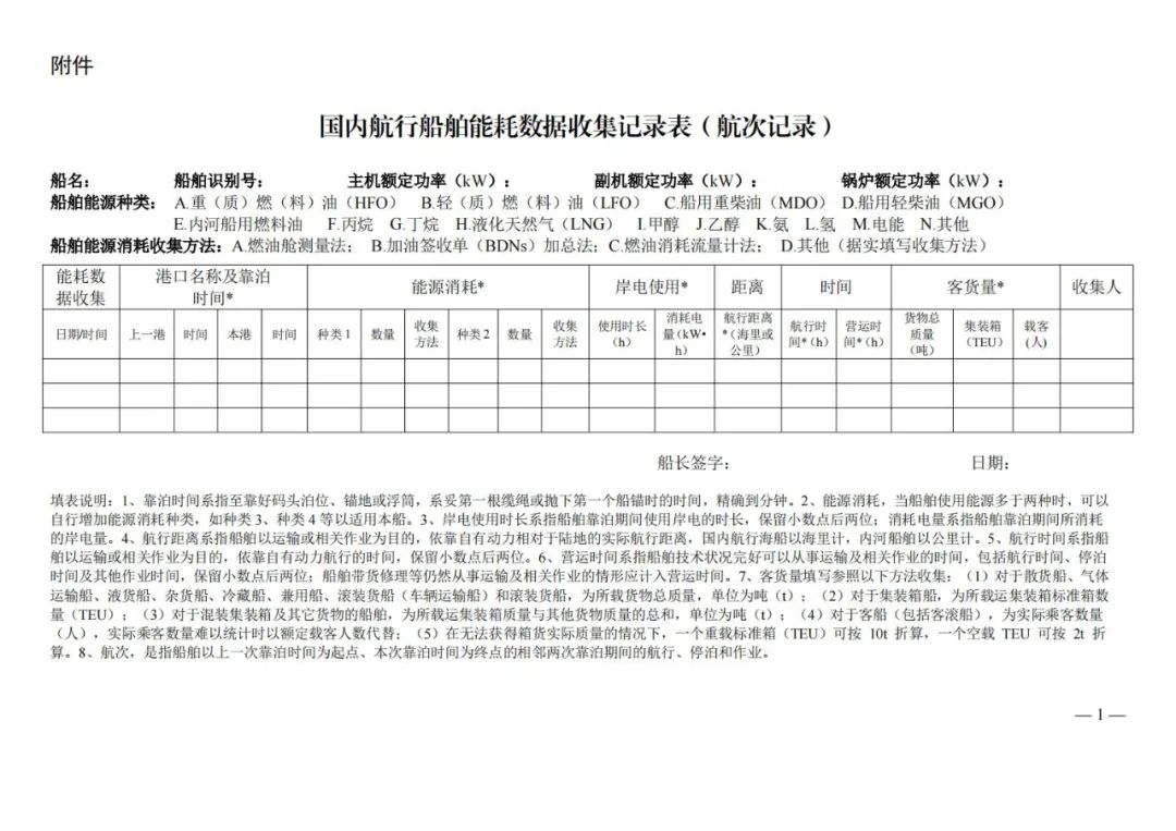 中国籍国内航行海船、内河船舶应当记录每日或者每一航次的船舶能耗数据,可采取电子记录或纸质记录方式,记录格式见附件。