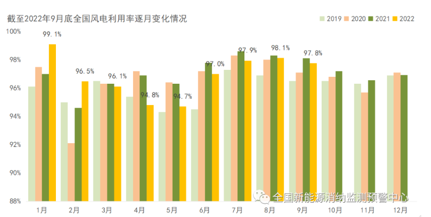 截至9月底全国风电利用率逐月变化情况