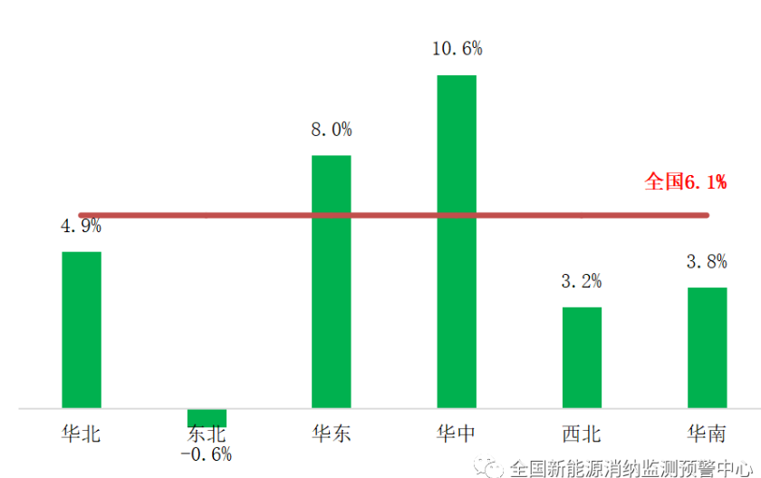 今年以来,全国累计全社会用电量达到6.49万亿千瓦时,同比增长4%。其中,三季度全国全社会用电量达到2.39万亿千瓦时,同比增长6.1%。三季度在稳经济政策措施逐步落地以及持续大范围极端高温天气等因素拉动下,用电量增速比二季度明显回升,为新能源消纳创造了良好条件。其中,7-8月全社会用电量增速较快,同比分别增长6.25%和10.7%,9月全社会用电量与去年同期持平。分地区来看,华中、华东地区三季度用电增速高于全国平均水平。