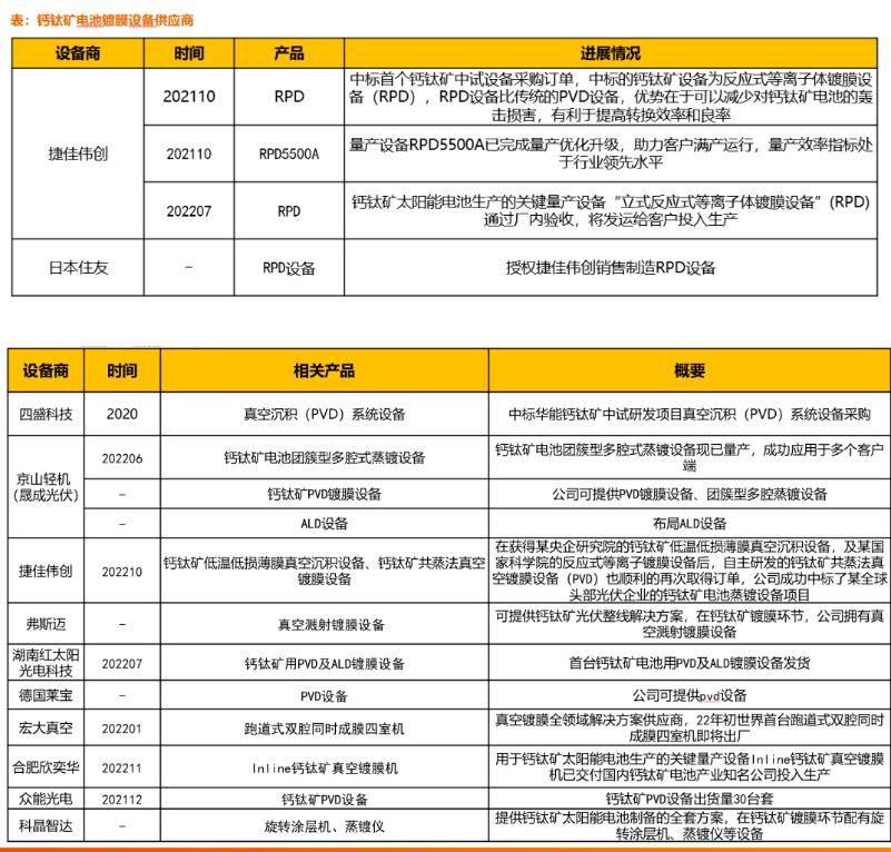 镀膜设备:用于制备阳极缓冲层、阴极缓冲层、背电极。国内钙钛矿电池镀膜设备商如下: