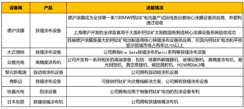 涂布设备:主要用于制作钙钛矿吸光层。其中狭缝涂布作为一种精密的涂布技术,其工作原理是涂布液在一定压力一定流量下沿着涂布模具的缝隙挤压喷出而转移到基材上。相比其它涂布方式,具有很多优点,如涂布速度快、精度高、湿厚均匀等;由于涂布系统封闭,在涂布过程中能防止污染物进入,浆料利用率高、能够保持浆料性质稳定,可同时进行多层涂布。国内钙钛矿电池涂布设备商主要如下: