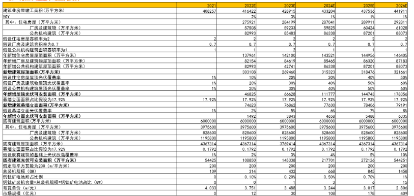 我们预计22年-26年钙钛矿电池在BIPV领域的市场规模为12/30/108/178/409亿。